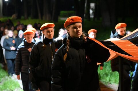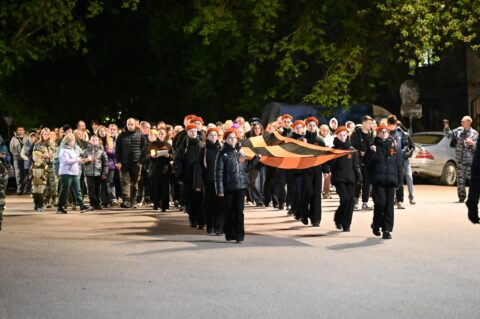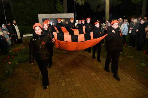 Молодые люди, возглавлявшие шествие, обратились к собравшимся с торжественными словами и развернув георгиевскую ленту начали шествие в молчании под сопровождение заупокойного колокольного звона.